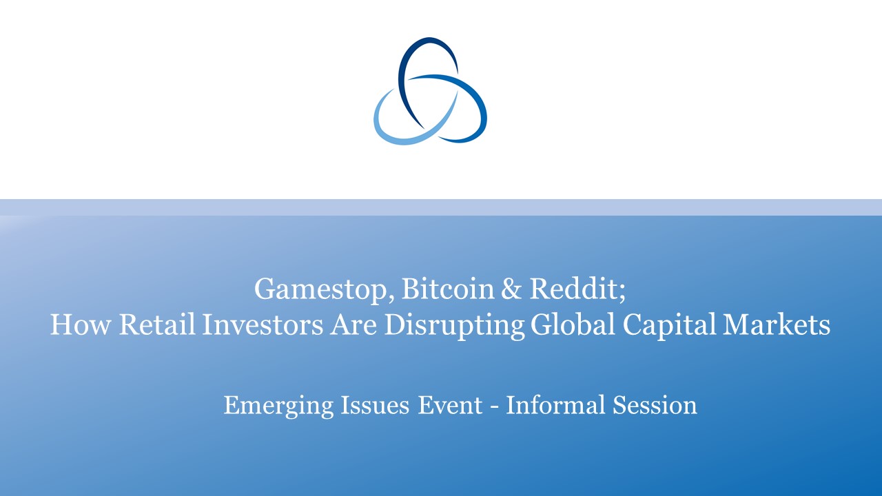 As an ‘Emerging Issues’ seminar the topic will be “Gamestop, Bitcoin and Reddit; how retail investors are disrupting global capital markets”.
